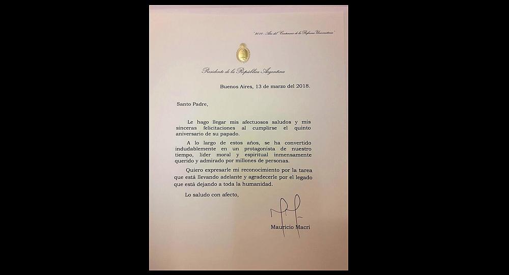"A lo largo de estos años se ha convertido indudablemente en un protagonista de nuestro tiempo, líder moral y espiritual inmensamente querido y admirado por millones de personas", agregó Macri en la misiva, que lleva su firma de puño y letra.