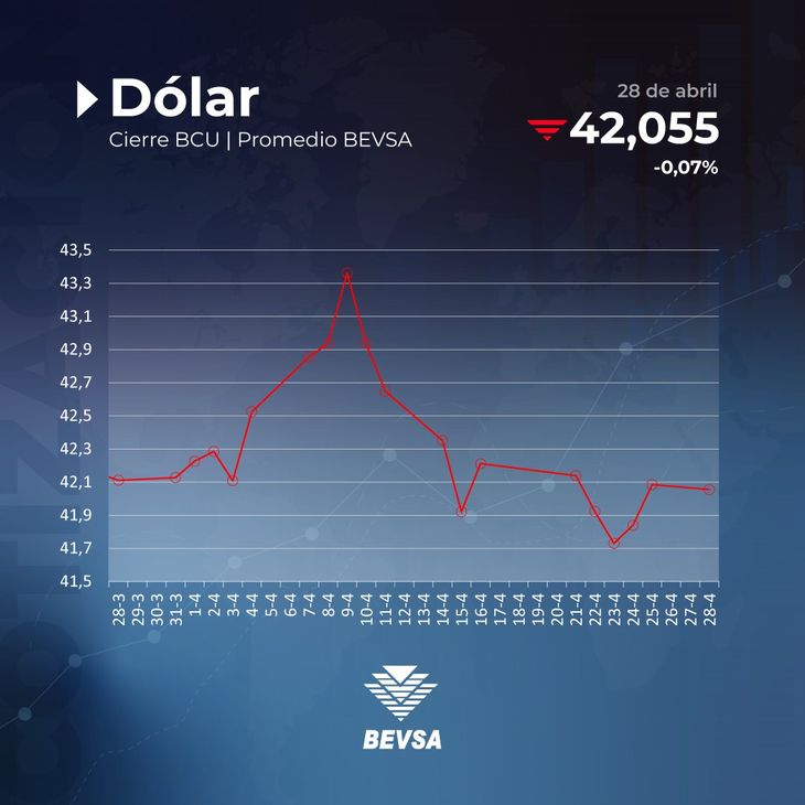 La cotización de cierre en la Bolsa Electrónica de Valores del Uruguay (Bevsa) fue de 42,030 pesos, mientras que el precio máximo fue de 42,100 pesos, y el mínimo de 42,000 pesos. Se realizaron un total de 66 transacciones, con un monto de operaciones por más de 35,8 millones de dólares. A su vez, hubo 3 operaciones de dólar OCT (26/08/2025) por 12 millones de dólares.