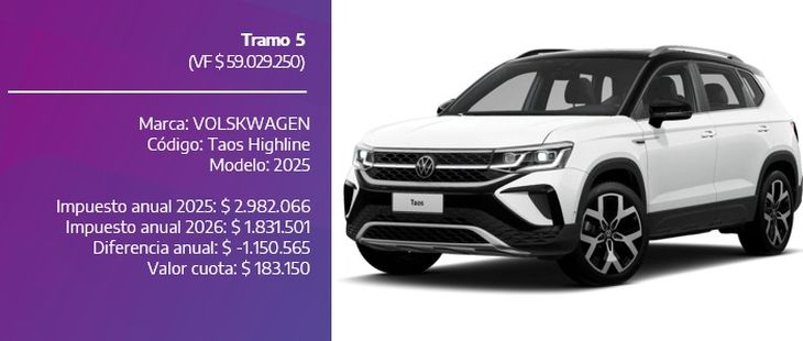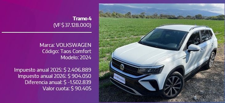 Volkswagen Taos Comfort 2024: el tributo anual será de $904.050, frente a los $2.406.889 abonados en 2025 (baja del 62%), unos $90.405 por cuota.