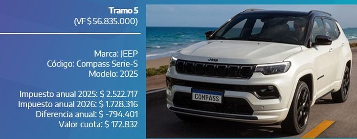 Jeep Compass Serie-S 2025: pagará $1.728.316 en 2026, frente a $2.522.717 este año (reducción del 31%), con cuotas de $172.832.