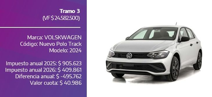 Volkswagen Polo Track 2024: pagará $409.861 en 2026, frente a $905.623 en 2025 (disminución del 45%), con cuotas de $40.986.