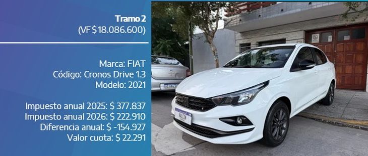Fiat Cronos Drive 2021: abonará $222.910 en 2026, frente a los $377.837 que pagó este año (una baja del 41%), equivalente a cuotas trimestrales de $22.291.