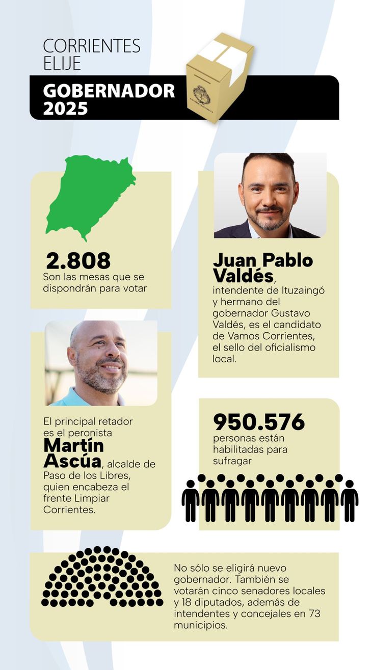 Enviado especial - Corrientes irá a las urnas este domingo para elegir gobernador, en un escenario con final abierto, donde el oficialismo local marcha como favorito ante el desafío de tres grandes frentes opositores. El mandatario actual, Gustavo Valdés, de la Unión Cívica Radical (UCR), no cuenta con reelección, por lo que la provincia tendrá un nuevo titular del Ejecutivo a partir de diciembre, independientemente del nombre propio que se imponga en el comicio.