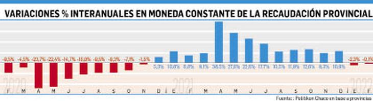 La instantánea pertenece a un informe de Politikon Chaco, que advierte que “lo relevante es que no se observaba caídas reales en el consolidado de la recaudación provincial desde noviembre de 2020, por lo cual existe un proceso de importante desaceleración en el crecimiento de la recaudación provincial, que en 2021 había experimentado un incremento muy significativo (+15% real)”.