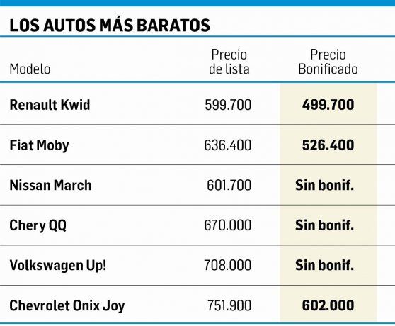 La consecuencia de este nuevo ajuste es que desaparecieron del mercado los autos de menos de $500.000. Esto, tomando incluso, los precios finales con bonificaciones. Para los planes de ahorro, que no se benefician con estos descuentos, la situación es peor. El auto más accesible del mercado por estos días es el Renault Kwid que tiene un precio de lista de $599.700. La terminal aplica una bonificación de $100.000 por lo que se vende a $499.700, una picardía del marketing para quedar por debajo de la barrera psicológica de los $500.000. En el bolsillo de los consumidores, no surte efecto. Más si se tiene en cuenta que a ese monto hay que sumarle costos como el de patentamientos, impuestos y flete. Otros de los modelos más accesibles son el Fiat Moby o el Nissan March que, aún con descuentos, quedan por arriba del “medio millón”. Un caso clásico de auto “económico” es el Chery QQ, un integrante tradicional de este ranking. Sin embargo, desde el año pasado, la marca china decidió expresar en dólares sus listas de precios que antes estaban en pesos. El valor de ese modelo es de u$s11.050, más de $670.000.