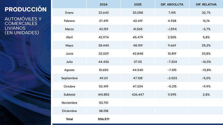 Sin embargo, las luces de alarma se encienden por el lado de la producción. Un mercado que en ventas creció un 55% no tiene su contrapartida en las fábricas locales. En el acumulado a octubre el alza es de apenas de 2,8%. En este caso, el saldo positivo se da por el mal primer semestre de 2024, ya que, por ejemplo, octubre 2025 terminó en una baja del 10% contra el mismo mes del año anterior.
