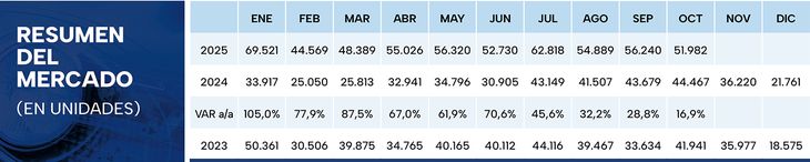 Con los números consolidados a octubre, el mercado acumuló subas en cada uno de los meses respecto a 2024. Alzas importantes que llevaron a un crecimiento de 55% en el acumulado. El mercado superará las 600 mil unidades en año completo; un volumen en línea con el potencial de la plaza local. Lejos aún de los récords de 2013, cuando se orilló el millón de unidades, pero a tono con buenos años para las ventas de 0KM.