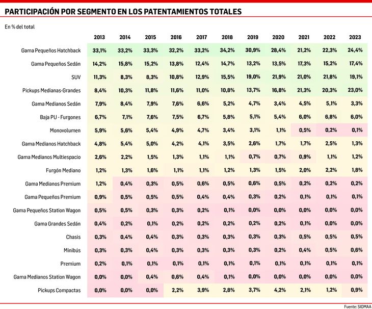 “Esa reducción en la oferta de los modelos que le daban más volumen al mercado, además de tener un impacto en la cantidad de vehículos patentados (menos de la mitad que en 2013), cambió también su fisonomía. Mientras que los vehículos pequeños pierden participación en el total de ventas, ganan las pickup y el segmento de las SUV”.