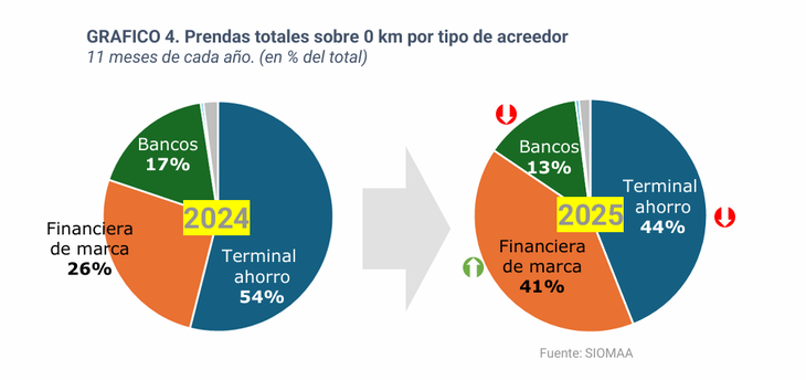 La dinámica en este segmento se alinea con la contracción general del crédito por la incertidumbre de fin de año. En la composición acumulada de acreedores sobre 0km, se puede ver una pequeña recuperación en la participación de la financiera de marca, que alcanzó el 41% del total de prendas en 2025 (vs. 26% en 2024). Por su parte, la porción del plan de ahorro continúa su descenso, cayendo al 44% (vs. 54% en 2024).