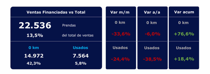 Por su parte, el mercado prendario de usados también cayó respecto al mes anterior aunque en menor medida (-24,4%). Esta fue la menor participación del año en el total de transferencias, con solo el 5,8% del mercado financiado.