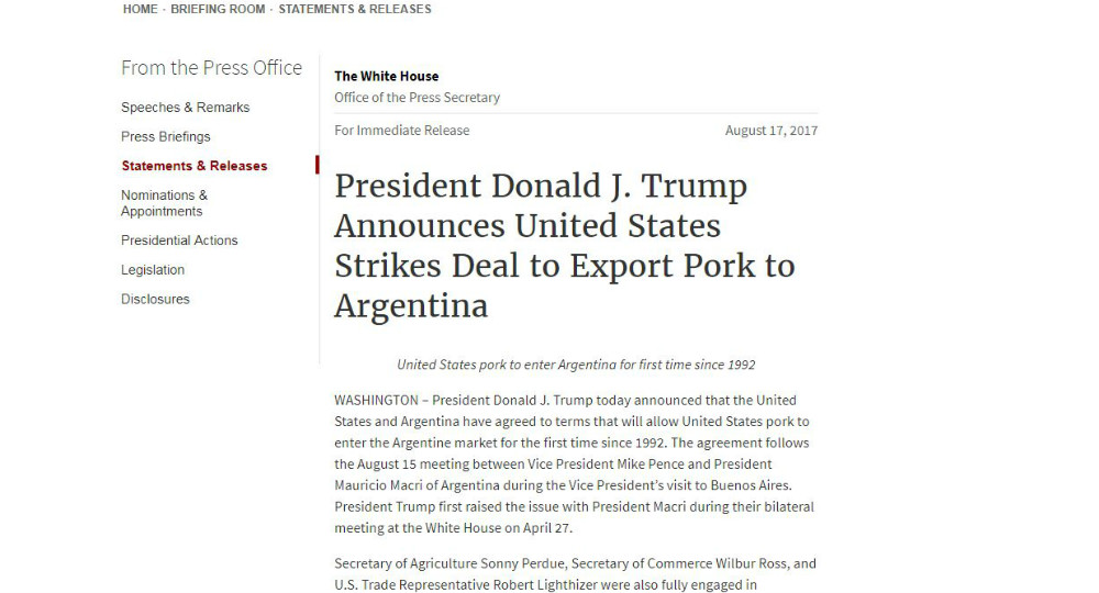Trump anunció que EEUU volverá a vender carne de cerdo a la Argentina