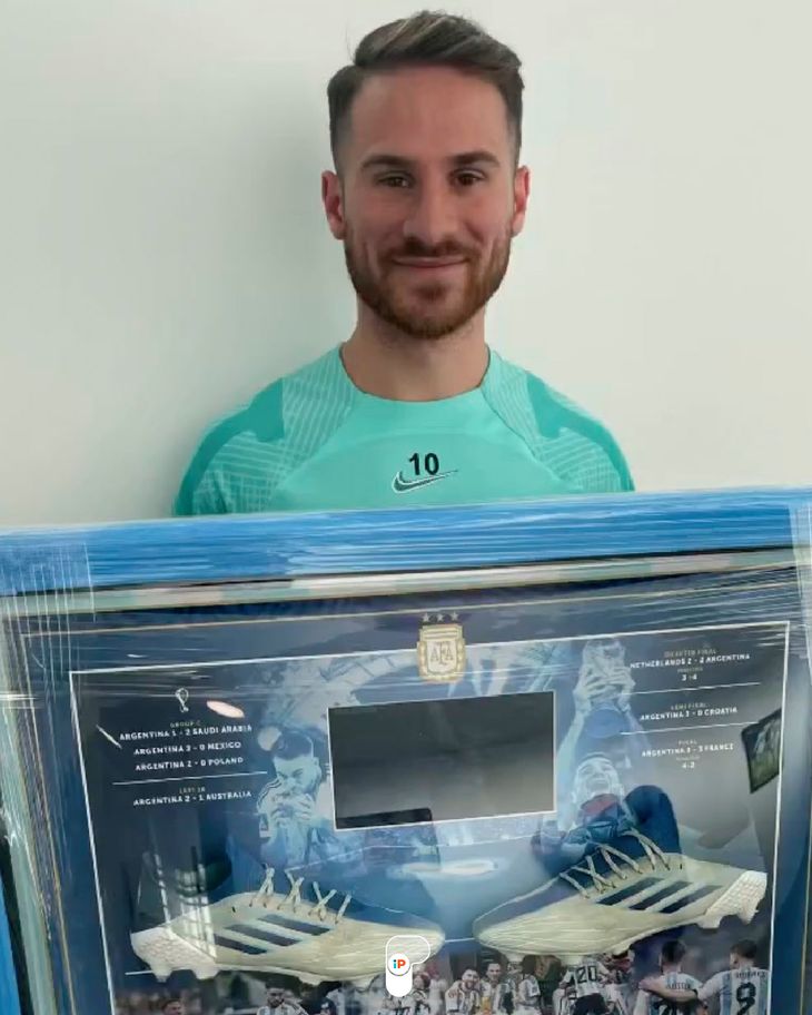 En el mismo, como se puede apreciar en la imagen, ubicó los botines que utilizó en el torneo junto a los resultados logrados y las respectivas fotos. Los mejores momentos acompañados del calzado usó durante toda la cita ecuménica, mostrados en un cuadro digno de museo. Increíble.