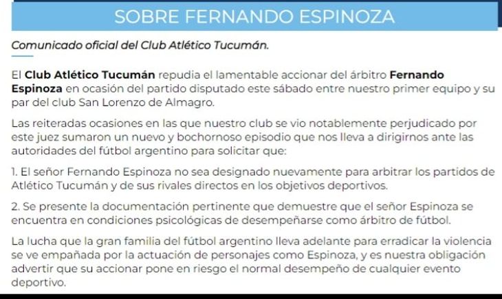 "Tras el desastroso arbitraje de anoche, no solo voy a volver a pedir que no dirija más a Atlético Tucumán sino que se analice seriamente si Espinoza está en condiciones psicológicas de dirigir y que las autoridades muestren la documentación que lo avale para arbitrar", concluyó.