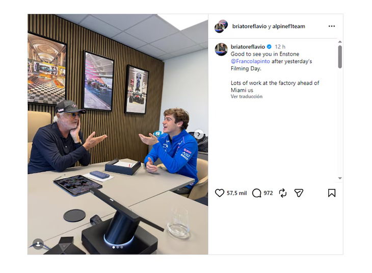 En relación a su viaje al país, quien le brindó su apoyo en las redes sociales fue Flavio Briatore, asesor principal de Alpine. El italiano compartió una publicación conjunta con Alpine donde ambos aparecen sonrientes en la base del equipo francés.