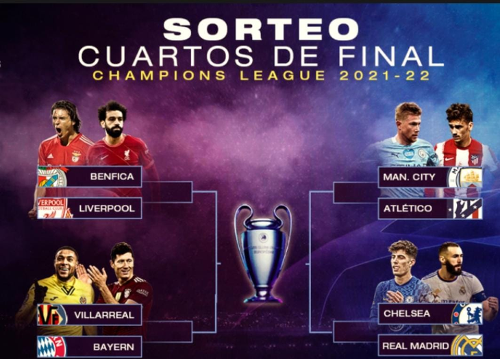 El sorteo de los cuartos de final de la Champions League determinó este viernes dos atractivos duelos angloespañoles, con el Chelsea (defensor del título) contra el Real Madrid y el Manchester City frente al Atlético de Madrid.