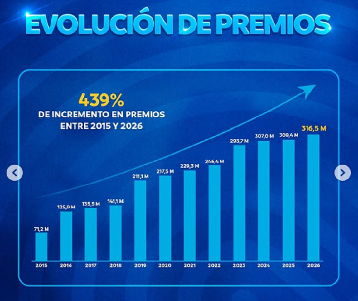 La distribución total de premios superará los u$s220.000.000, consolidando el crecimiento sostenido del torneo. Además, se mantiene el incentivo al mérito deportivo por partido ganado en Fase de Grupos, que asciende a u$s340.000, reforzando la competitividad en cada encuentro.