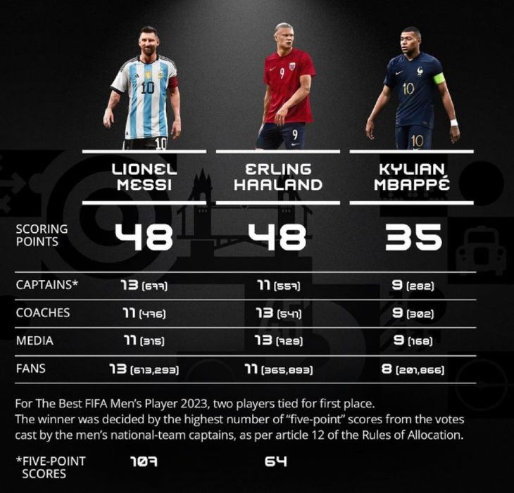 En un empate en 48 puntos con el noruego Erling Haaland en la votación, el rosarino se terminó quedando con el premio por el voto de los capitanes, que es el que decide en caso de igualdad.