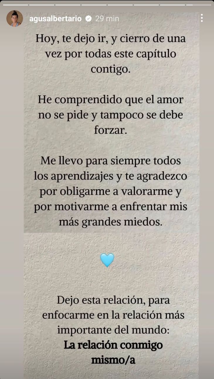 El miércoles por la tarde, la jugadora de Las Leonas había compartido un sentido mensaje en redes: "Hoy, te dejo ir, y cierro de una vez por todas este capítulo contigo. He comprendido que el amor no se pide y tampoco se debe forzar. Me llevo para siempre todos los aprendizajes y te agradezco por obligarme a valorarme y por motivarme a enfrentar mis más grandes miedos. Dejo esta relación, para enfocarme en la relación más importante del mundo, la relación conmigo mismo/a", citó Albertario en su historia de Instagram.