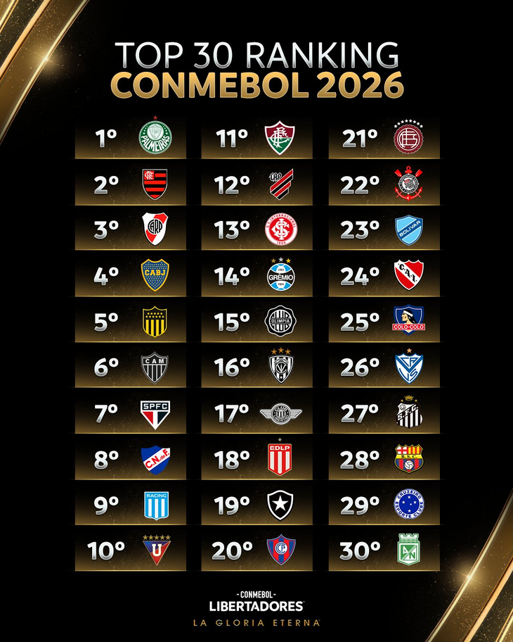 La Conmebol anunció este martes el ranking de equipos que se utilizará para la temporada 2026 y que servirá para definir los bombos de la Copa Libertadores y Copa Sudamericana, con varios cambios en la parte alta de la tabla.
