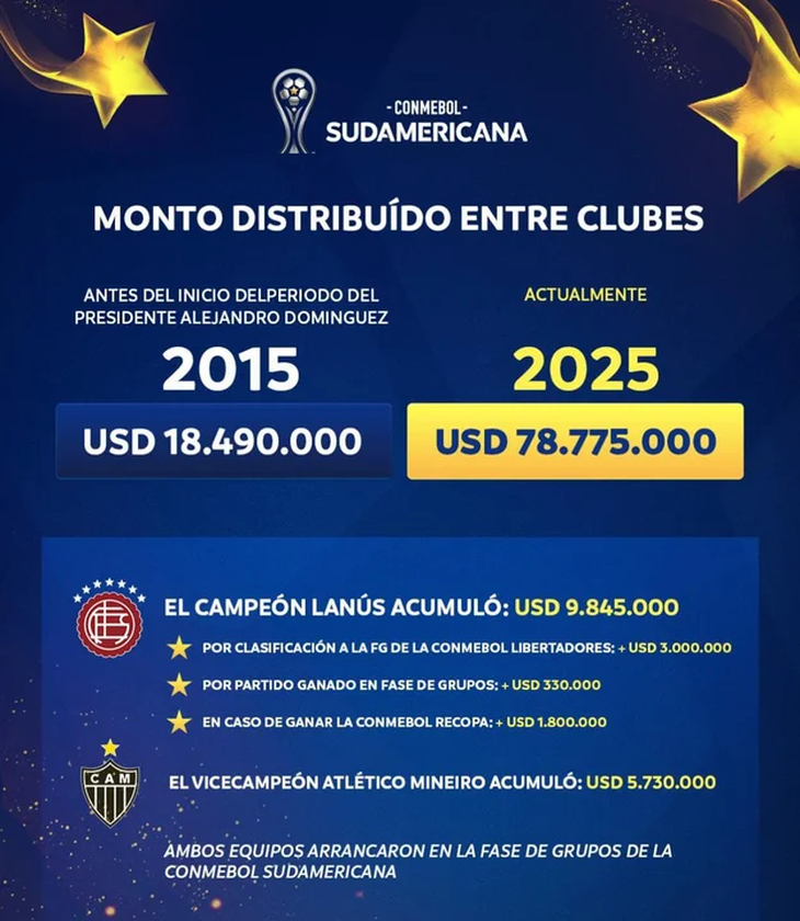 A través de una publicación gráfica, el organismo sudamericano mostró la evolución del dinero que recibieron los campeones y subcampeones del torneo, contrastando los montos entregados en 2015 con los correspondientes a 2025. El resultado fue impactante: los premios aumentaron un 426% en una década.