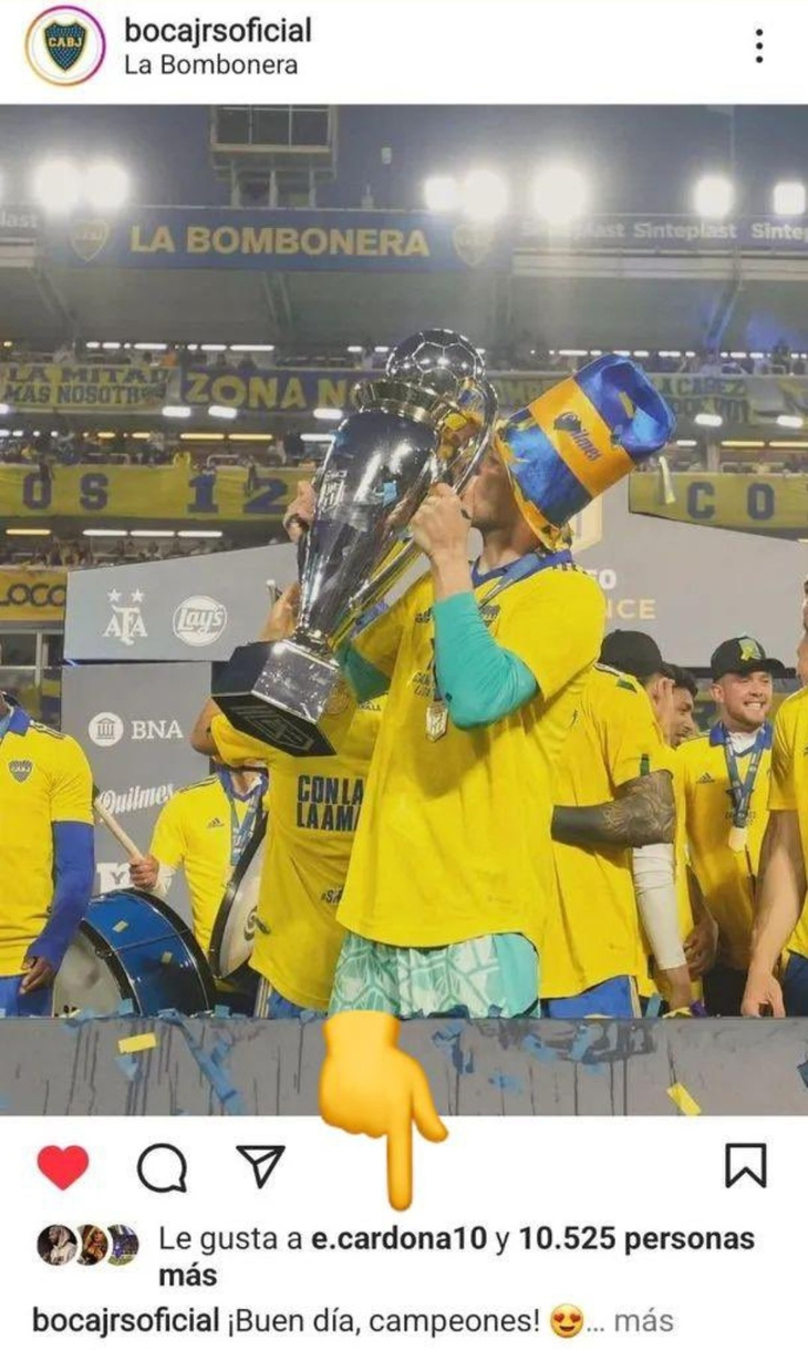Cardona sumó otro granito de arena para dejarlo fuera de la "Academia" posiblemente a fin de año al marcar sorpresivo "me gusta" a una publicación de Boca en donde se lo ve a Agustín Rossi besando la copa y debajo la leyenda "¡Buen día, campeones!".