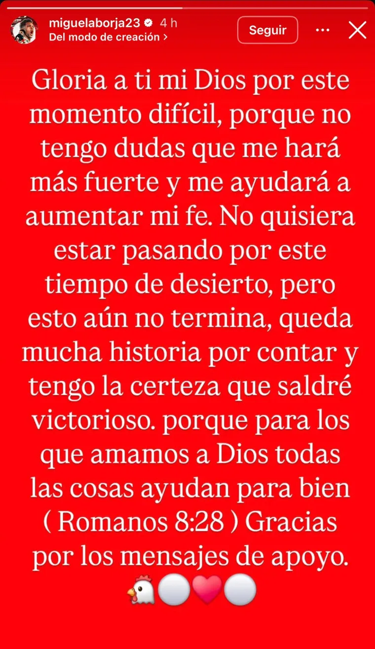 Fiel a su estilo, Borja optó por la impronta religiosa y dejó un mensaje con frases hechas, lleno de luz y fe. “Gloria a ti mi Dios por este momento difícil, porque no tengo dudas que me hará más fuerte y me ayudará a aumentar mi fe. No quisiera estar pasando por este tiempo de desierto, pero esto aún no termina, queda mucha historia por contar y tengo la certeza que saldré victorioso. Porque para los que amamos a Dios todas las cosas ayudan para bien (Romanos 8:28). Gracias por los mensajes de apoyo”, publicó.