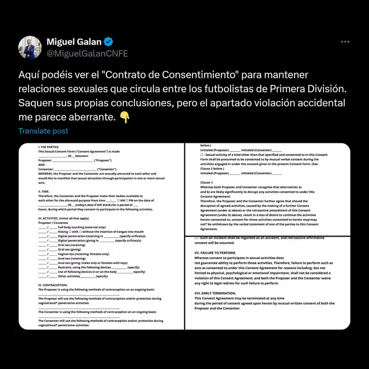 "Aquí pueden ver el 'Contrato de Consentimiento' para mantener relaciones sexuales que circula entre los futbolistas de Primera División. Saquen sus propias conclusiones, pero el apartado violación accidental me parece aberrante", escribió Galán en su cuenta oficial de X con las imágenes del polémico documento.