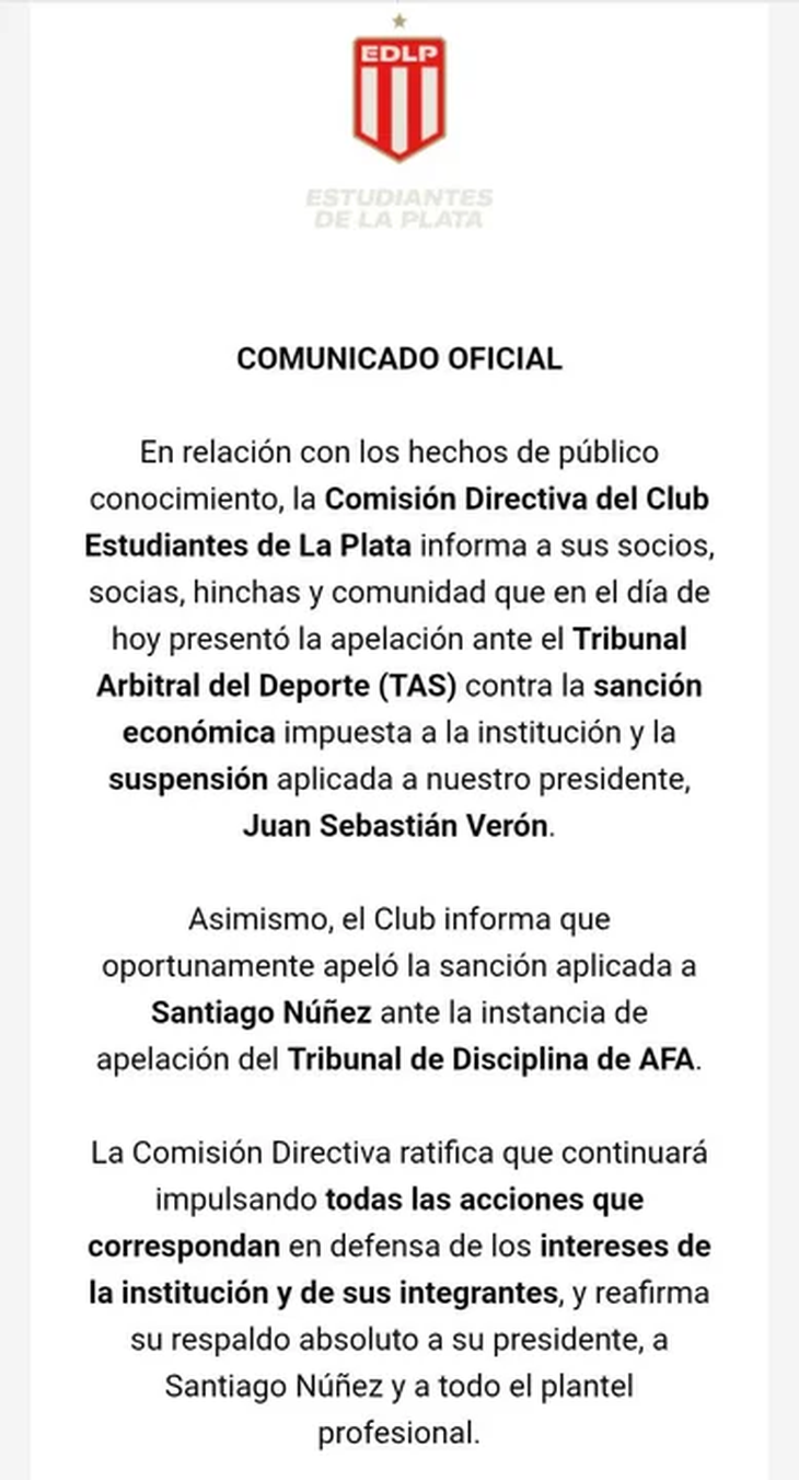 “En el día de hoy presentó la apelación ante el Tribunal Arbitral del Deporte (TAS) contra la sanción económica impuesta a la institución y la suspensión aplicada a nuestro presidente, Juan Sebastián Verón”, expresa el comunicado, en una frase que refuerza la centralidad del reclamo y la figura del actual titular del club, ídolo histórico y referente institucional.
