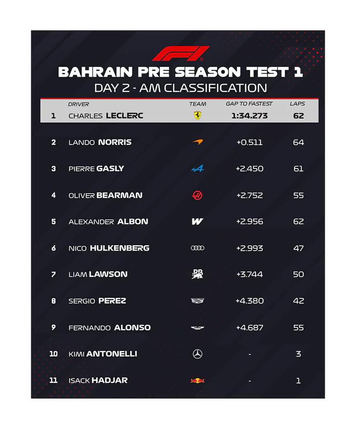 El piloto de Ferrari, que hace varios años es uno de los principales animadores de la categoría, registró un récord de vuelta de 1:34,273. Además, su monoplaza demostró mucha fiabilidad, ya que pudo dar 62 giros en el Circuito Internacional de Bahréin.