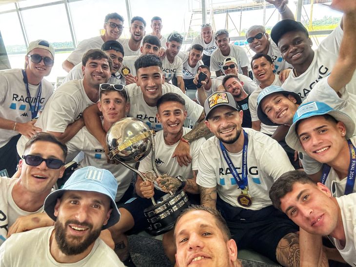 "Racing. Campeón Sudamericana 2024", se leía en decenas de banderas que se agitaban en la calle. Caminando y cantando, se vieron padres con sus hijos pequeños sobre los hombros, amigos vestidos con camiseta de Racing, transpirados, felices, con bebidas frescas para enfrentar el calor. Todo fue válido para festejar.