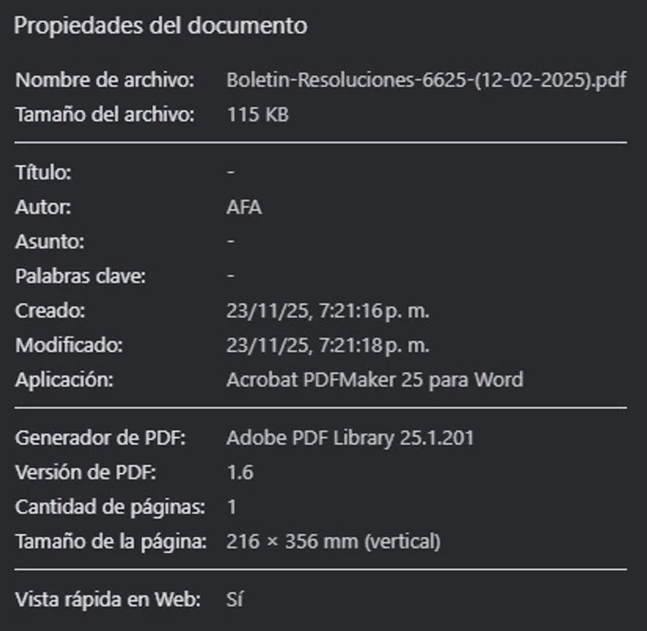 El documento en el que se ampara la AFA para sancionar a Estudiantes es el Boletín N°6625, cuya fecha data del 12 de febrero del 2025, pero cuando se ingresa a los detalles del PDF se observa que fue creado el 23 de noviembre a las 19:21, en pleno encuentro entre el “Pincha” y Rosario Central.