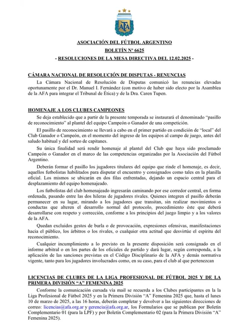 En el mismo documento se detalla que “los futbolistas del club homenajeado ingresarán caminando por ese corredor central, en forma ordenada, pasando entre las dos hileras de jugadores rivales", mientras que “quienes integren el pasillo deberán permanecer en su lugar, mirando a los jugadores que transitan, sin realizar movimientos o conductas que alteren el desarrollo normal del protocolo, procedimiento éste que deberá desarrollarse con respeto y corrección”.