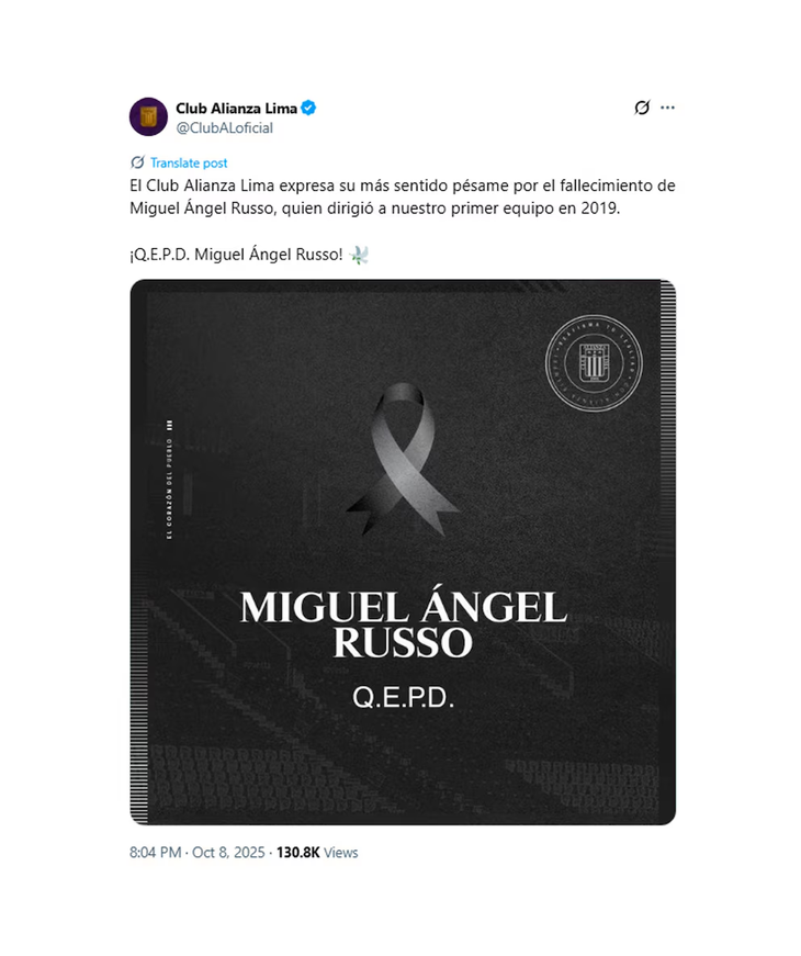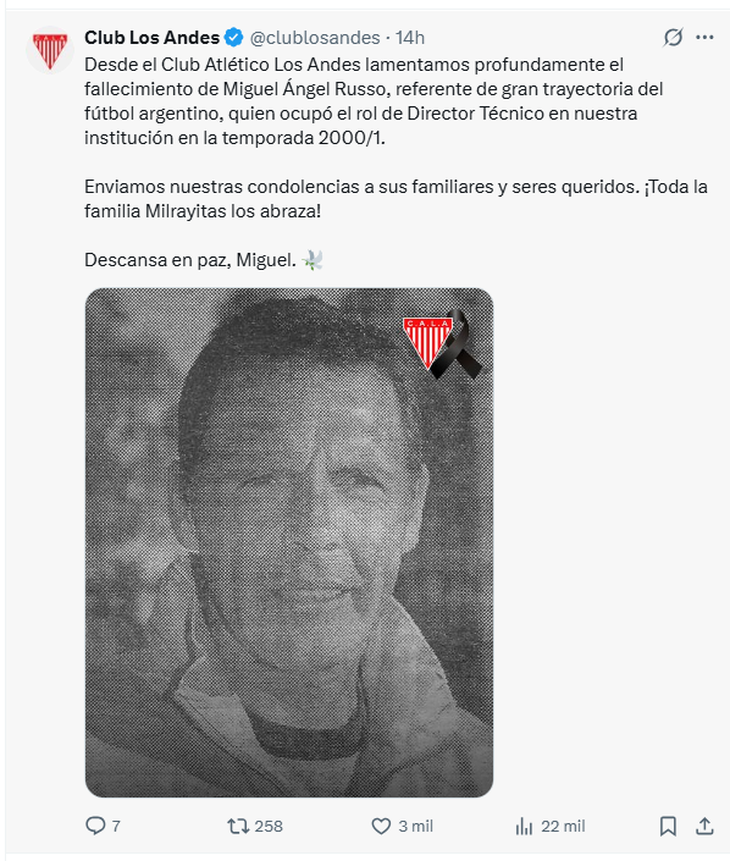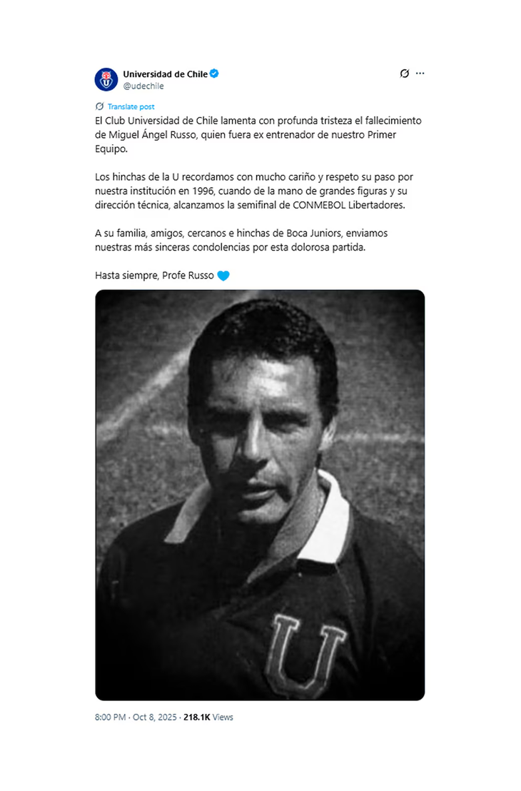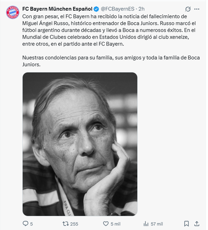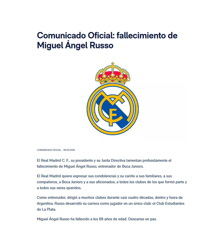 El "Xeneize" lamentó la muerte del entrenador, quien dirigía al club desde junio de este año y que había tenido ciclos anteriores en 2017 y 2021. "El Club Atlético Boca Juniors comunica con profunda tristeza el fallecimiento de Miguel Ángel Russo. Miguel deja una huella imborrable en nuestra institución y será siempre un ejemplo de alegría, calidez y esfuerzo. Acompañamos a su familia y a sus seres queridos en este momento de dolor", expresaron desde las redes sociales institucionales.