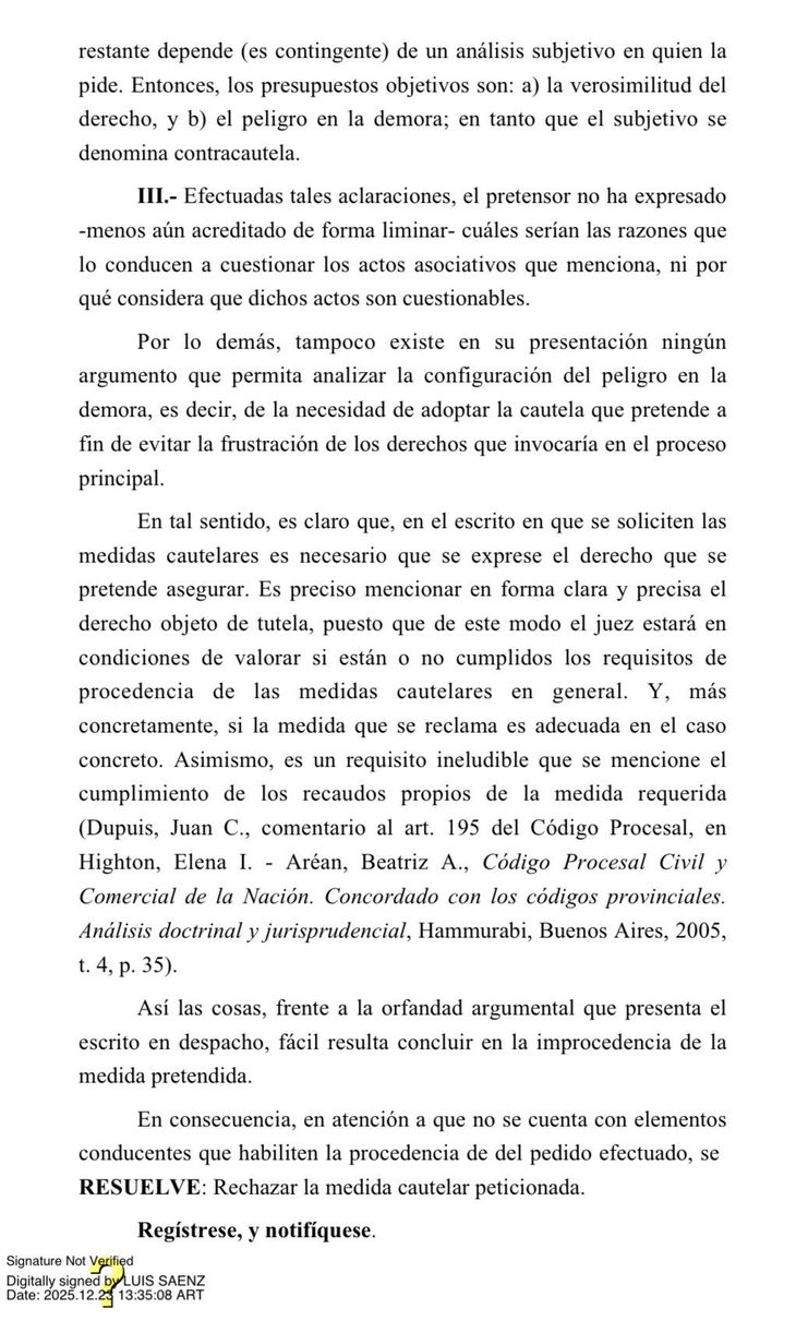 "No se cuenta con elementos conducentes que habiliten la procedencia del pedido efectuado", justificó el Juzgado, teniendo en cuenta que Moretti en su presentación no expresó ni acreditó "cuáles serían las razones que lo conducen a cuestionar los actos asociativos que menciona, ni por qué considera que dichos actos son cuestionables".