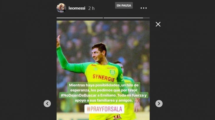 Messi se une de esta manera a las voces, encabezadas por el padre del jugador desaparecido, que piden que continúe la búsqueda después que el jueves la policía de Guernesey anunciara que se abandonaban las labores activas de rastreo, al considerar "ínfimas" las opciones de supervivencia.