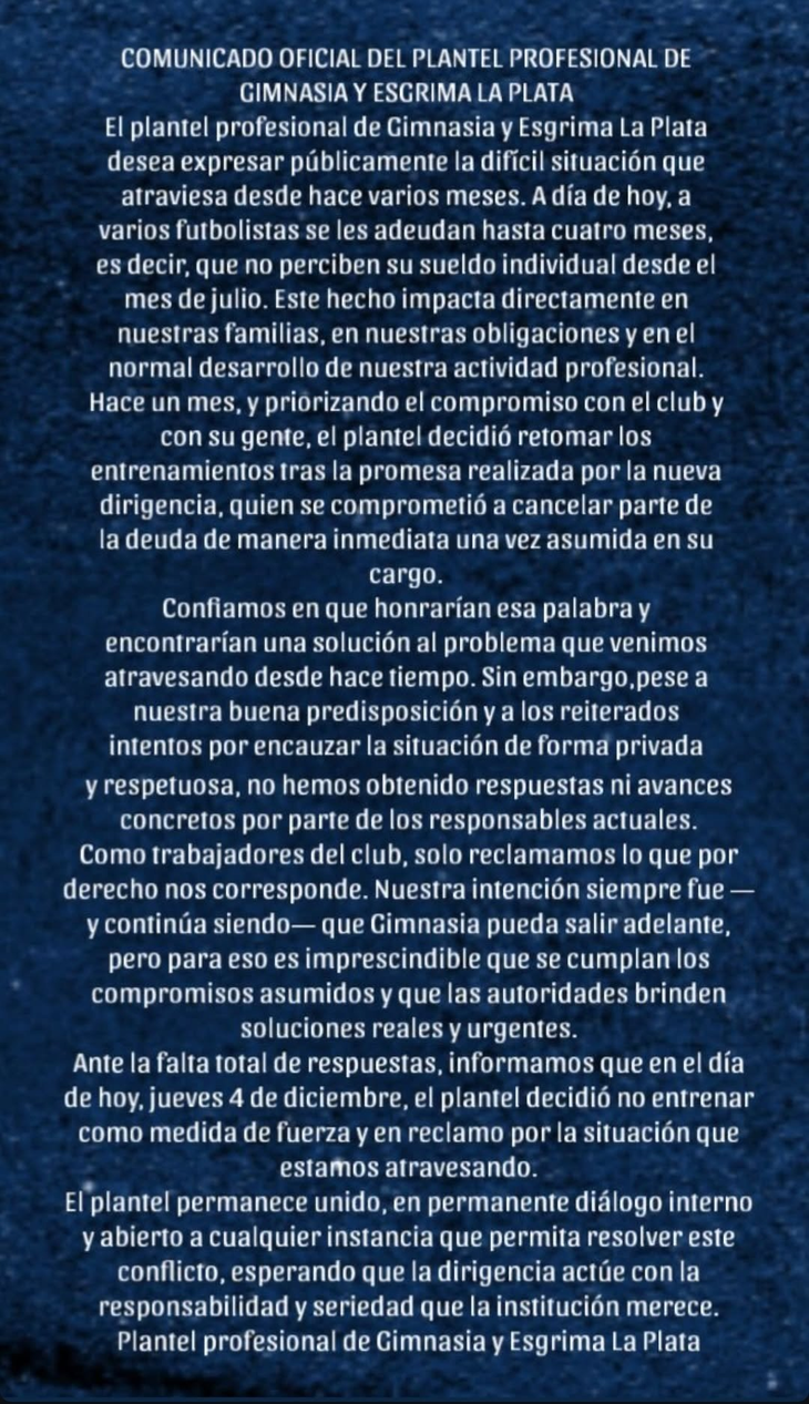 “El plantel profesional de Gimnasia y Esgrima La Plata desea expresar públicamente la difícil situación que atraviesa desde hace varios meses. A día de hoy, a varios futbolistas se les adeudan hasta cuatro meses, es decir, que no perciben su sueldo individual desde el mes de julio. Este hecho impacta directamente en nuestras familias, en nuestras obligaciones y en el normal desarrollo de nuestra actividad profesional.