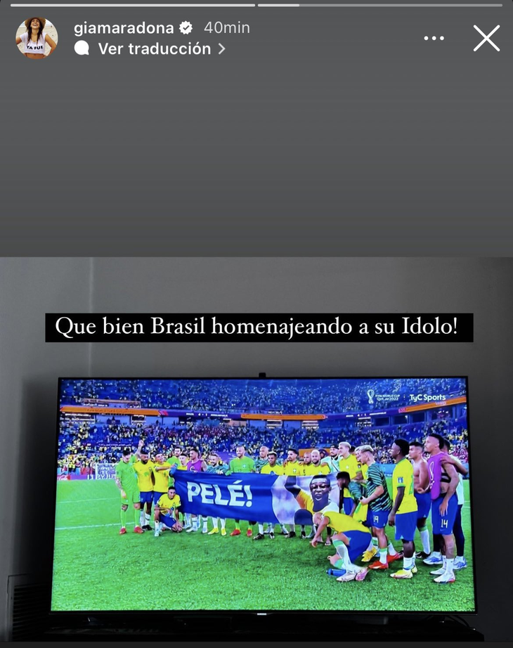 "¡Qué bien Brasil homenajeando a su ídolo!", publicó Gianinna en una historia de Instagram en la que se ve cómo los futbolistas brasileños portaban una bandera de Pelé.