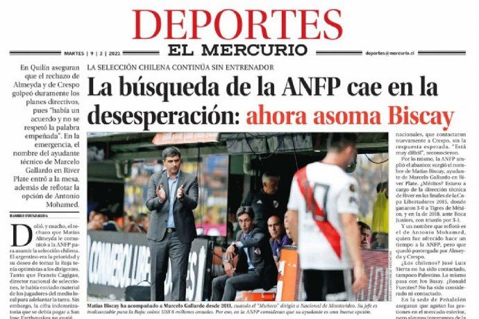 La información sobre el interés de la Federación chilena por Matías Biscay la dio a conocer el diario El Mercurio. “La búsqueda de la ANFP cae en la desesperación: ahora asoma Biscay”. Con ese título explosivo, en Chile aseguran que el histórico ayudante de campo de Marcelo Gallardo ahora figura como uno de los dos principales candidatos para dirigir a la selección de ese país tras la renuncia de Reinaldo Rueda para marcharse a Colombia.