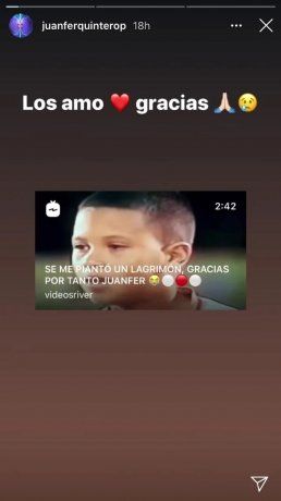 Quintero se hizo eco del homenaje viral en redes y lo compartió en una historia de Instagram, donde además aprovechó para dejarle un mensaje a los hinchas de River: "Los amo. Gracias".
