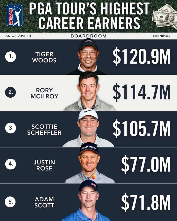 Scheffler es el tercero en el podio, con una cifra total de u$s 105,700.000 y se encuentra a u$s 15.300.000 del registro de Woods.