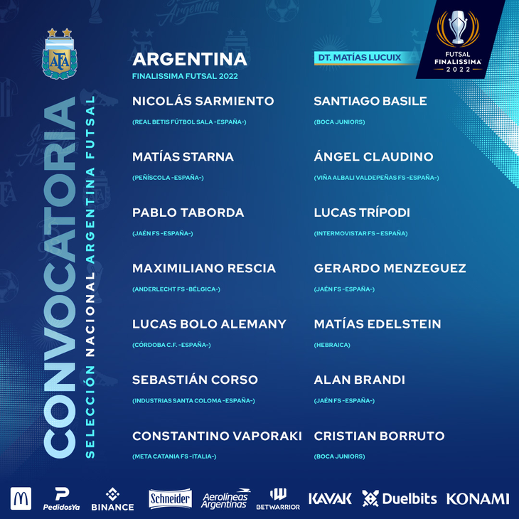 La selección argentina de futsal buscará quedarse con la primera Copa Finalissima de la disciplina, de la cual será anfitriona en el Parque Roca, y que contará con los mejores combinados de la Conmebol y la UEFA.