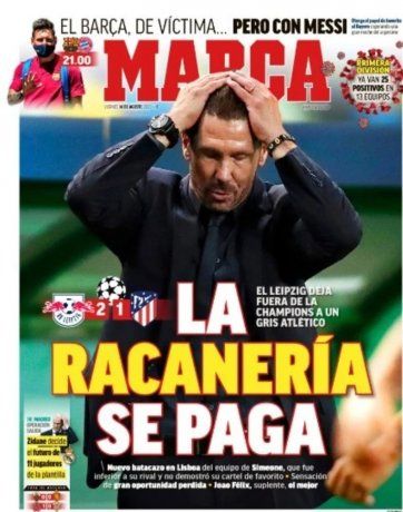"Nuevo batacazo en Lisboa del equipo de Simeone, que se fue inferior a su rival y no demostró su cartel de favorito. Sensación de gran oportunidad perdida. Joao Félix, suplente, el mejor", y resaltó el periódico. "Lo del Leipzig pasa a formar parte de la galería de horrores del cholismo. Un palo que no se olvidará", agregó.