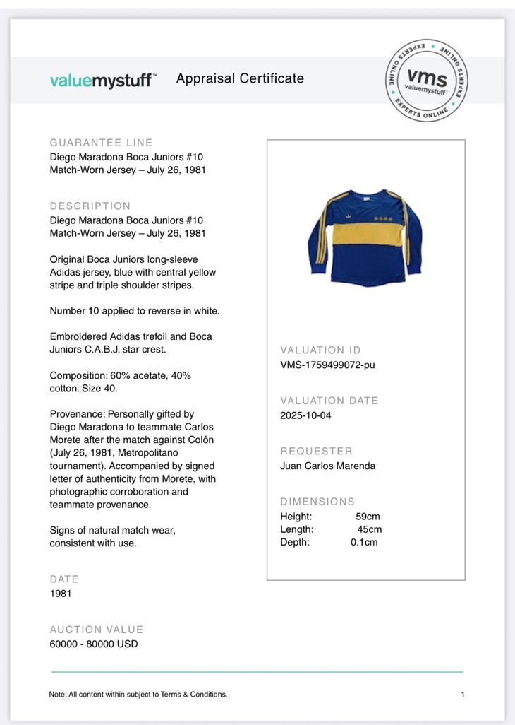 Uno de los aspectos centrales del valor de la prenda es su procedencia directa, certificada por Carlos Morete, excompañero de Maradona en Boca. En un certificado de autenticidad firmado, Morete dejó constancia de que la camiseta fue regalada personalmente por Maradona al finalizar el partido y permaneció bajo su custodia hasta 2025.