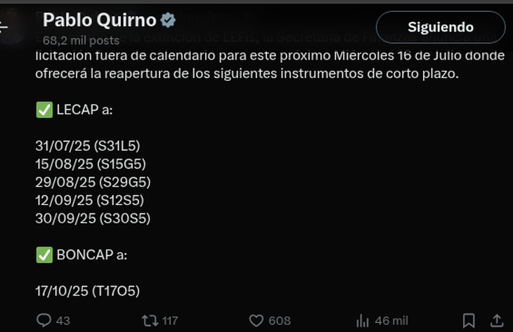 El secretario de Finanzas, Pablo Quirno, informó a través de la red social X que esa dependencia pondrá a disposición de las entidades financieras letras y bonos capitalizables “fuera de calendario”, en el marco de la extinción de las LEFIs.