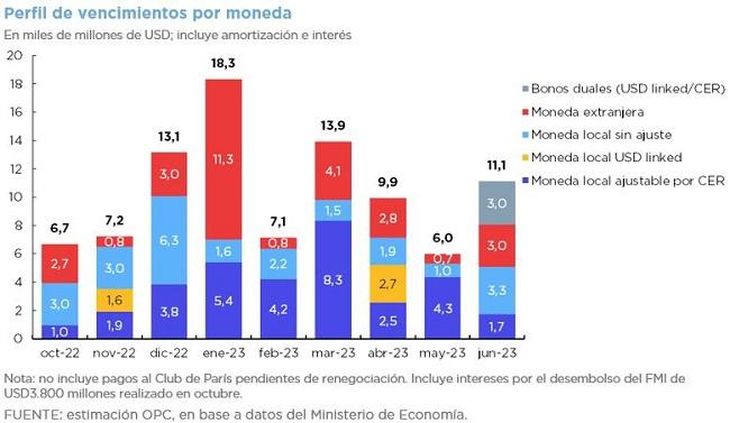 "Para lo que resta de 2022, la mayoría de los vencimientos corresponden a títulos públicos en moneda nacional, por el equivalente a US$ 13.802 millones. También se destacan los pagos de capital e intereses al FMI por aproximadamente u$s5.625 millones. Por otro lado, para el primer semestre de 2023 se estiman pagos por u$s66.406 millones, de los cuales u$s37.102 millones son vencimientos de títulos públicos en pesos", detalló la OPC.