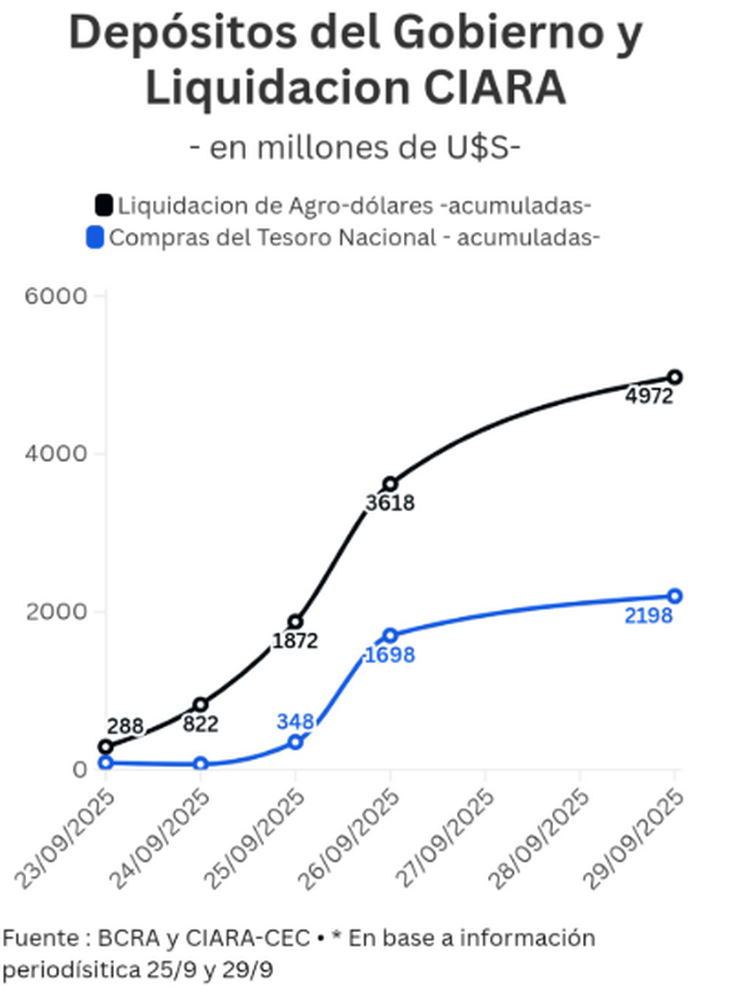 Vale recordar que en apenas cinco jornadas los agroexportadores liquidaron u$s4.972 millones, una cifra inédita en la historia para un período similar. En este marco, el equipo económico de Luis Caputo aprovechó para acumular divisas, aunque solo compró el 44% de ese caudal de billetes.