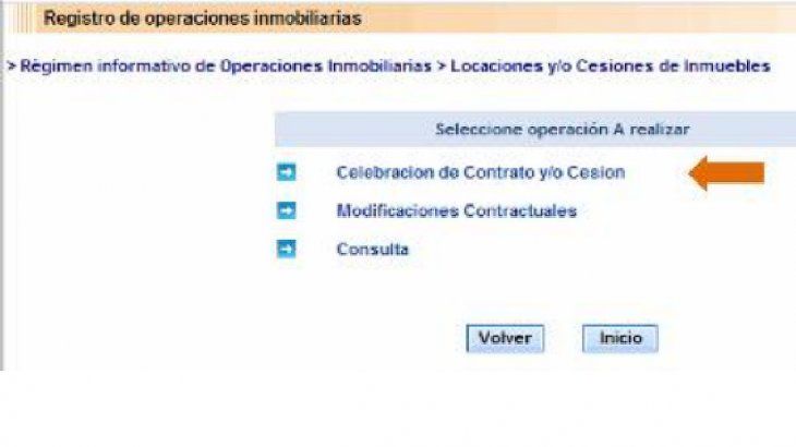 - Seleccionar la 1° opción: “Celebración de Contrato y/o Cesión” para que el sistema te permita registrar una nueva operación.