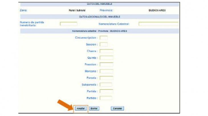 - El sistema despliega en pantalla la solicitud de los datos catastrales de la propiedad. Para completar estos datos, se recomienda tener el título de la propiedad a mano. Una vez que corrobores que todos los datos son correctos, hacer click en “Aceptar". Una vez ingresado el “Número de Partida Inmobiliaria“, el sistema solicita información adicional. Recordá que una vez ingresados los datos correctamente, tenés que hacer click en el botón que dice "Próximo paso".