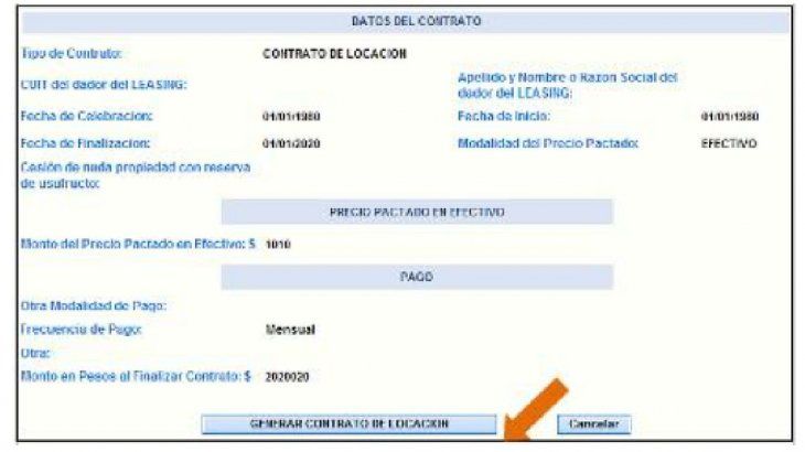 - Una vez ingresado el CUIT/CUIL/CDI del locador, el sistema desplegará una pantalla para completar los datos del "Contrato Celebrado". Para completar estos datos, te recomendamos tener la información a mano. Si los datos que completaste son correctos, hacé click en “Generar Contrato de Locación” y el sistema te emitirá automáticamente un código de recepción de transferencia de información.
