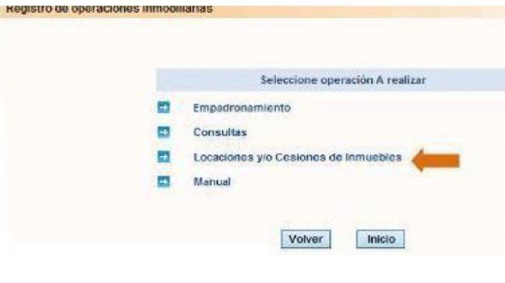 - Luego de seleccionar el servicio “Registro de Operaciones Inmobiliarias", aparecerá en la pantalla las opciones que permite realizar el sistema: hacer click en la 3° opción “Locaciones y/o Cesiones de Inmuebles“.